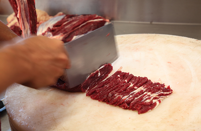 黄牛的出肉率是相当低的,加上福合诚对牛肉品质的把控,对牛肉的分检近乎苛刻,一头上千斤的成年壮牛,仅剩约30%的肉可以走上餐桌,真正拿来打火锅开涮。万众喜爱的吊龙肉和匙仁仅占整头牛的1%,算得上是牛肉中的极品